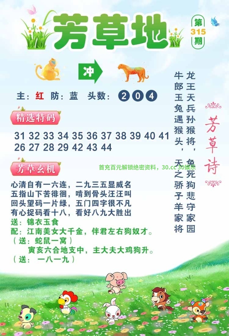| 314期芳草玄机:大财进出赚钱快,八九二七重复买。辞旧岁一出猴红,迎新年鸡飞枝头。蛇鼠一窝洞冲天,哼哈二将显神通。素心触拔自成丝,解读关赘不问师。 芳草诗:三零四六为正码,二八横空二点四。啸一声心惊胆跳,龙前牛后中间二。 特肖:马猴鸡兔鼠羊牛 波色:蓝红 头数:421 |